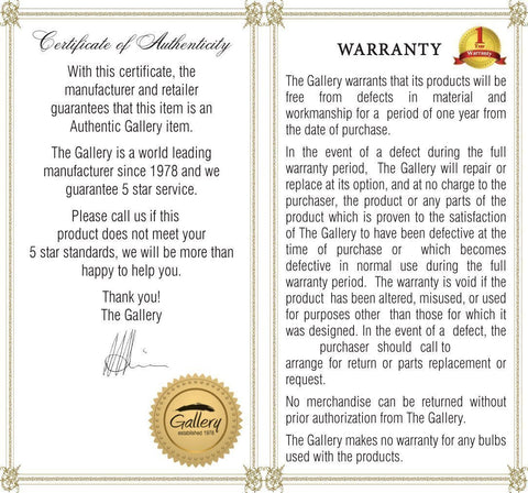 1. Each item comes with a Certificate of Authenticity, certifying this product is an authentic Gallery lighting fixture.
