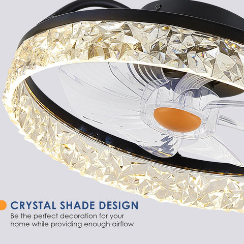 This 15.7" ceiling fan with lights features a sleek and modern design. This bladeless fan light, with 7-ABS blades and acrylic crystal frames, offers a black modern style ideal for interior decoration, suitable for bedrooms, basements, garages, kids' rooms, small places, etc.